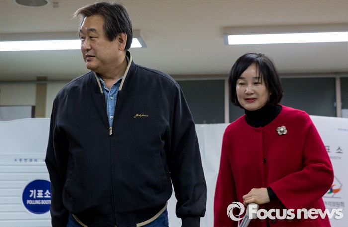 (부산=포커스뉴스) 제20대 국회의원선거일인 13일 오전 부산 영도구 동삼1동 제6투표소에서 김무성 새누리당 대표와 아내 최양옥 씨가 투표하고 있다.