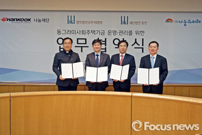 (서울=포커스뉴스) 한국타이어는 사단법인 나눔과미래, 법무법인 태평양, 재단법인 동천과 사회적 취약계층의 주거 안정을 목표로 하는 ‘동그라미 사회주택기금’의 운영·관리를 위한 업무협약(MOU)을 체결했다고 13일 밝혔다.