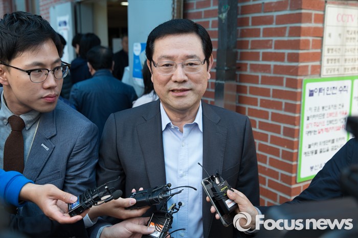 (광주=포커스뉴스) 제20대 국회의원 선거일인 13일 오전 광주 광산구 산월동 봉산초등학교에서 이용섭 더불어민주당 광주 광산구을 후보가 투표를 마치고 취재진 질문에 답하고 있다.