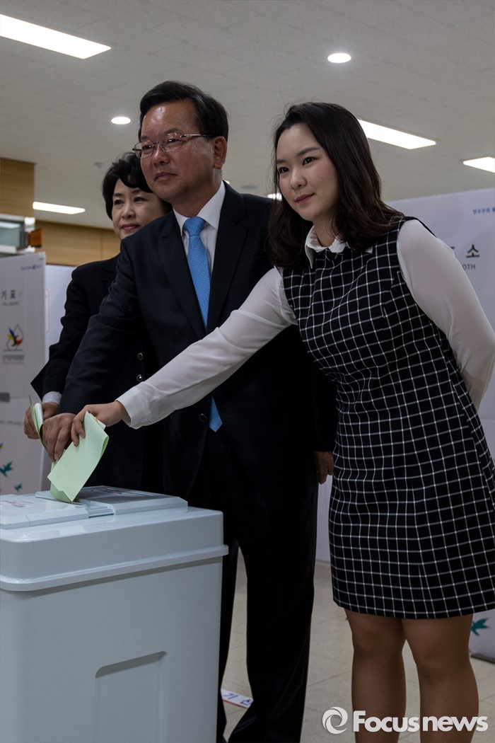 (대구=포커스뉴스) 제20대 국회의원선거날인 13일 오전 대구 수성구 만촌주민센터에 마련된 투표소에서 김부겸 더불어민주당 대구 수성갑 후보가 투표를 하고 있다.