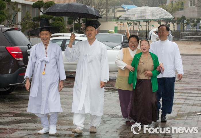 (논산=포커스뉴스) 제20대 국회의원 선거가 시작된 13일 오전 충남 논산 연산면 제1투표소에서 양지서당 유복엽 큰 훈장과 가족들이 투표를 마치고 투표소를 나서고 있다.
