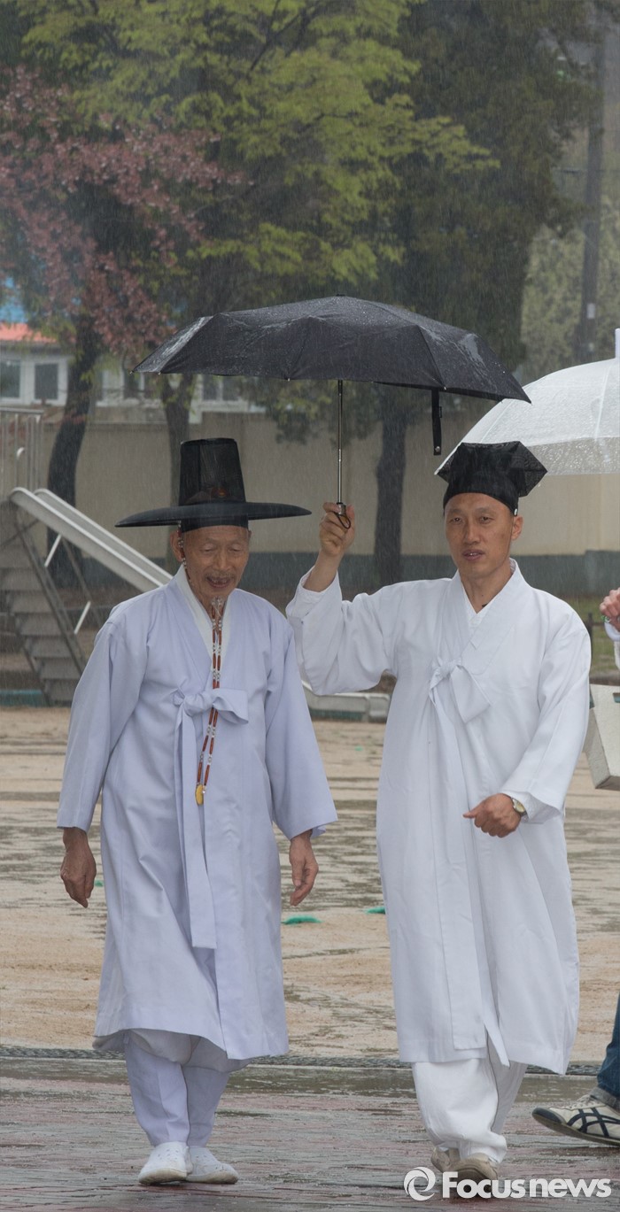 (논산=포커스뉴스) 제20대 국회의원 선거가 시작된 13일 오전 충남 논산 연산면 제1투표소에서 양지서당 유복엽 큰 훈장과 가족들이 투표를 마치고 투표소를 나서고 있다.