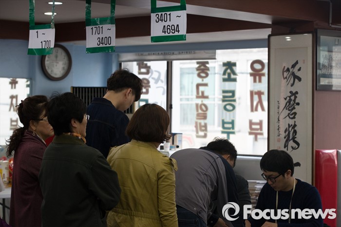 (서울=포커스뉴스) 제20대 국회의원선거일인 13일 오전 서울 강서구 화곡제8동 제5투표소에서 유권자들이 투표를 위해 본인확인절차를 밟고 있다.