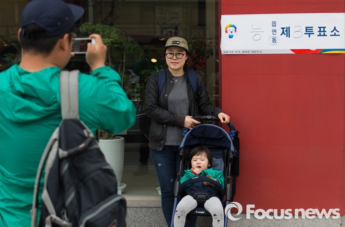 (서울=포커스뉴스) 제20대 국회의원선거일인 13일 오전 서울 광진구 능동 제3투표소에서 한 가족이 투표를 마친 뒤 기념촬영을 하고 있다.