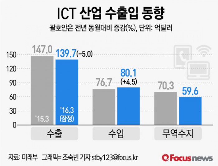 (서울=포커스뉴스) 13일 미래창조과학부가 발표한 3월 정보통신기술(ICT) 수출입 동향은 전년 동월대비 5.0% 감소한 139억7000만달러, 수입은 4.5% 증가한 80억1000만, 수지는 59억6000만달러 흑자로 잠정 집계됐다.
