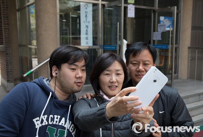 (서울=포커스뉴스) 2016 제20대 국회의원선거날인 13일 오후 서울 서초구 서이초등학교에 마련된 투표소에서 투표를 마친 유권자들이 인증샷을 찍고 있다.