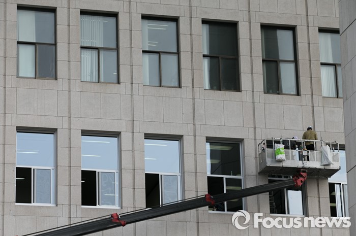 (서울=포커스뉴스) 20대 총선 투표일인 13일 오후 서울 여의도 국회 본청에서 업체 관계자들이 창문교체 작업을 하고 있다.