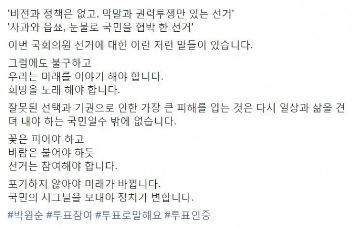 박 시장은 "'비전과 정책은 없고 막말과 권력투쟁만 있는 선거', '사과와 읍소, 눈물로 국민을 협박 한 선거'"라며 "이번 국회의원 선거에 대한 이런저런 말들이 있다"고 말했다.