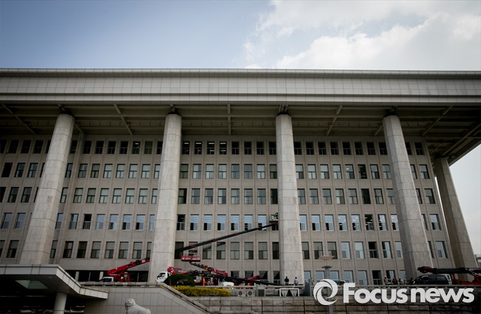 (서울=포커스뉴스) 20대 총선 투표일인 13일 오후 서울 여의도 국회 본청에서 업체 관계자들이 창문교체 작업을 하고 있다.
