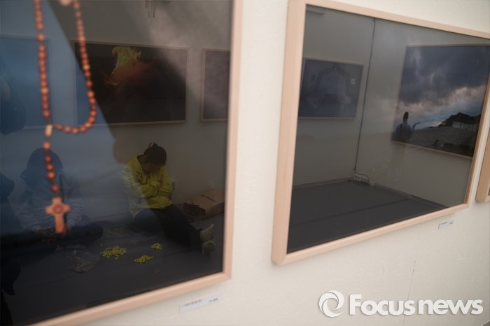 (서울=포커스뉴스) 제20대 국회의원선거날인 13일 오후 서울 종로구 광화문 광장에서 열린 세월호 2주기 추모행사 사진전 전시장안에서 리본공작소 시민이 휴식을 취하고 있다.
