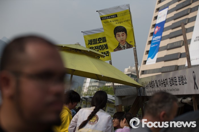 (서울=포커스뉴스) 제20대 국회의원선거날인 13일 오후 서울 종로구 광화문 광장에서 열린 세월호 2주기 추모행사 옆에 마련된 광화문 분향소를 시민들이 지나고 있다.