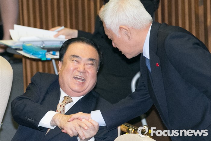 (서울=포커스뉴스) 13일 오후 6시 KBS·MBC·SBS 지상파 방송3사가 공동조사, 발표한 4·13 총선 출구조사 결과에 따르면 경기 의정부갑 지역구에서는 더민주당 문희상후보가 44.5%로 당선이 예상된다.(서울=포커스뉴스) 김한길(오른쪽) 더불어민주당 의원과 문희상 의원이 31일 오전 서울 여의도 국회 본회의장에서 인사하고 있다. 2015.12.31 박철중 기자