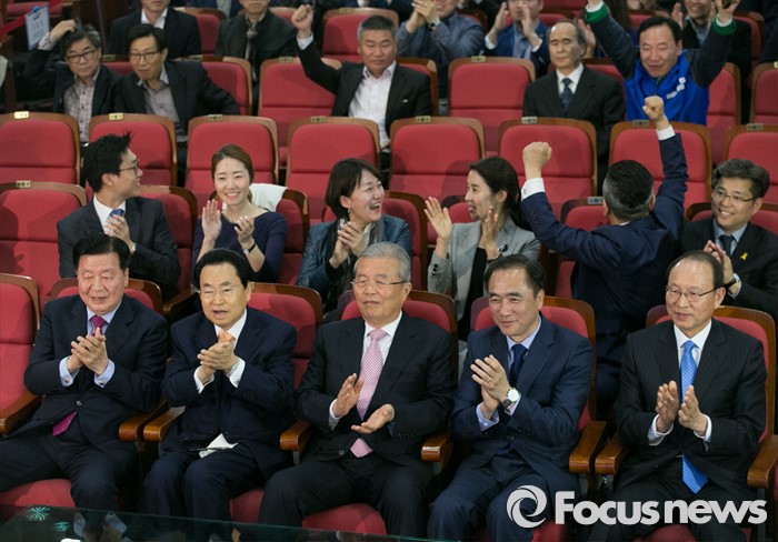(서울=포커스뉴스) 20대 총선 투표일인 13일 오후 서울 여의도 국회 의원회관 대회의실에 마련된 더불어민주당 개표상황실에서 김종인 비대위 대표 겸 선대위원장 등 선대위원들이 출구조사 및 개표방송을 시청하며 환호하고 있다. 앞줄 왼쪽부터 이근식, 송현섭 부위원장, 김 대표, 정장선 총선기획단장, 최운열 국민경제상황실장.
