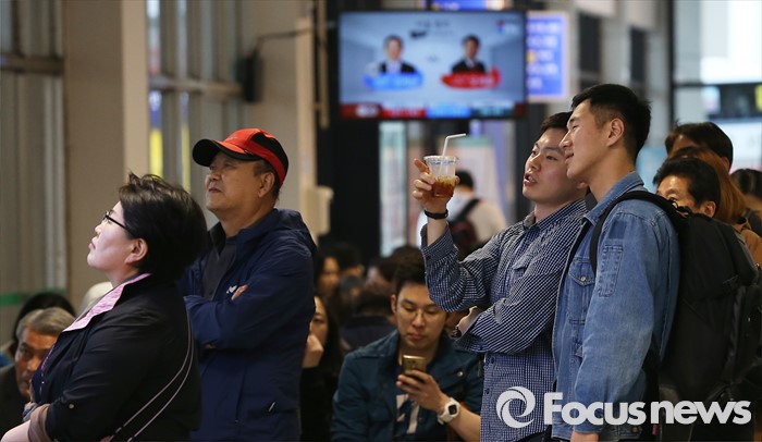 (서울=포커스뉴스) 제20대 국회의원선거일인 13일 오후 서울 서초구 고속터미널에서 시민들이 출구조사 발표 방송을 시청하고 있다.