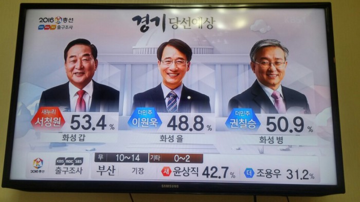 (서울=포커스뉴스) 13일 오후 6시 KBS·MBC·SBS 지상파 방송3사가 공동조사, 발표한 4·13 총선 출구조사 결과에 따르면 경기 화성갑에서는 새누리당 서청원 후보가 53.4%로 당선이 유력한 것으로 나타났다.<사진출처=KBS 캡쳐>