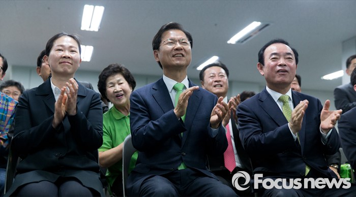(광주=포커스뉴스) 제20대 국회의원 선거일인 13일 오후 광주 서구 국민의당 광주광역시당에서 천정배(가운데) 국민의당 공동대표와 권은희(왼쪽) 국민의당 광산구을 후보가 출구조사 결과를 보고 박수를 치고 있다. 오른쪽은 장병완 동구남구갑 후보.