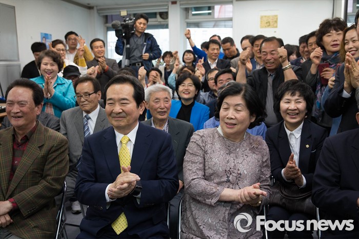 (서울=포커스뉴스) 제20대 국회의원선거일인 13일 오후 서울 종로구 정세균 더불어민주당 종로구 후보의 사무실에서 지지자들이 개표방송을 보고 환호하고 있다.