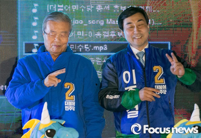(서울=포커스뉴스) 13일 오후 6시 KBS·MBC·SBS 지상파 방송3사가 공동 조사, 발표한 4·13 총선 출구조사 결과에 따르면 안양 만안에서는 더불어민주당 이종걸 후보가 46.5%로 당선이 예상된다.(안양=포커스뉴스) 4일 오후 경기도 지하철 1호선 안양역 앞 광장에 김종인(왼쪽) 더불어민주당 비대위 대표 겸 선대위원장과 안양 만안구 후보인 이종걸 원내대표가 로고송에 맞춰 선거율동을 선보이고 있다. 2016.04.04 박동욱 기자