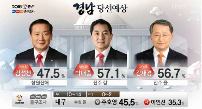 (서울=포커스뉴스)13일 오후 6시 KBS·MBC·SBS 지상파 방송3사가 공동조사, 발표한 4·13 총선 출구조사 결과에 따르면 경남 창원진해 지역구에서는 김성찬 새누리당 후보가 47.5%로 당선이 유력한 것으로 나타났다.<사진출처=KBS 출구조사 방송화면 캡쳐>