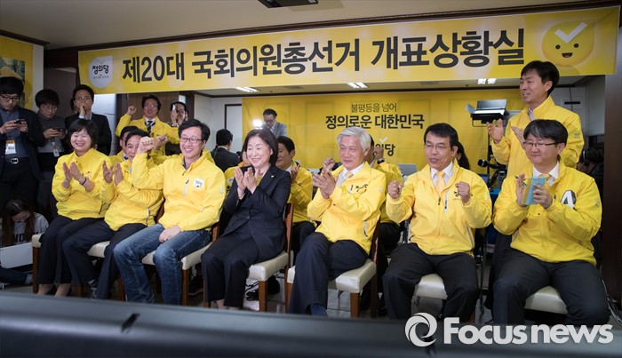 (서울=포커스뉴스) 2016 제20대 국회의원선거날인 13일 오후 서울 영등포구 정의당사에 설치된 개표상황실에서 심상정 정의당 상임대표를 비롯한 당직자들이 방송사들의 출구조사 결과를 지켜보고 있다.