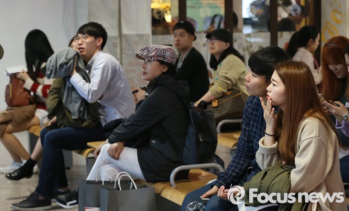 (서울=포커스뉴스) 제20대 국회의원선거일인 13일 오후 서울 서초구 고속터미널에서 시민들이 출구조사 결과발표 방송을 시청하고 있다.