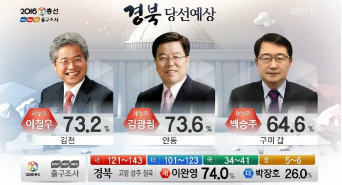 (서울=포커스뉴스)13일 오후 6시 KBS·MBC·SBS 지상파 방송3사가 공동조사, 발표한 4·13 총선 출구조사 결과에 따르면 경북 구미갑 지역구에서는 백승주 새누리당 후보가 64.6%로 당선이 유력한 것으로 나타났다.<사진출처=KBS 출구방송 화면캡쳐>