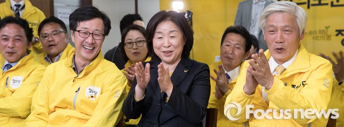 (서울=포커스뉴스) 2016 제20대 국회의원선거날인 13일 오후 서울 영등포구 정의당사에 설치된 개표상황실에서 심상정 정의당 상임대표를 비롯한 당직자들이 방송사들의 출구조사 결과를 지켜보고 있다.