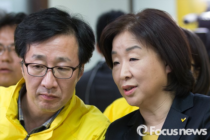 (서울=포커스뉴스) 2016 제20대 국회의원선거날인 13일 오후 서울 영등포구 정의당사에 설치된 개표상황실에서 방송사들의 출구조사 결과를 지켜보던 심상정 정의당 상임대표와 천호선 공동선거대책위원장이 대화를 나누고 있다.