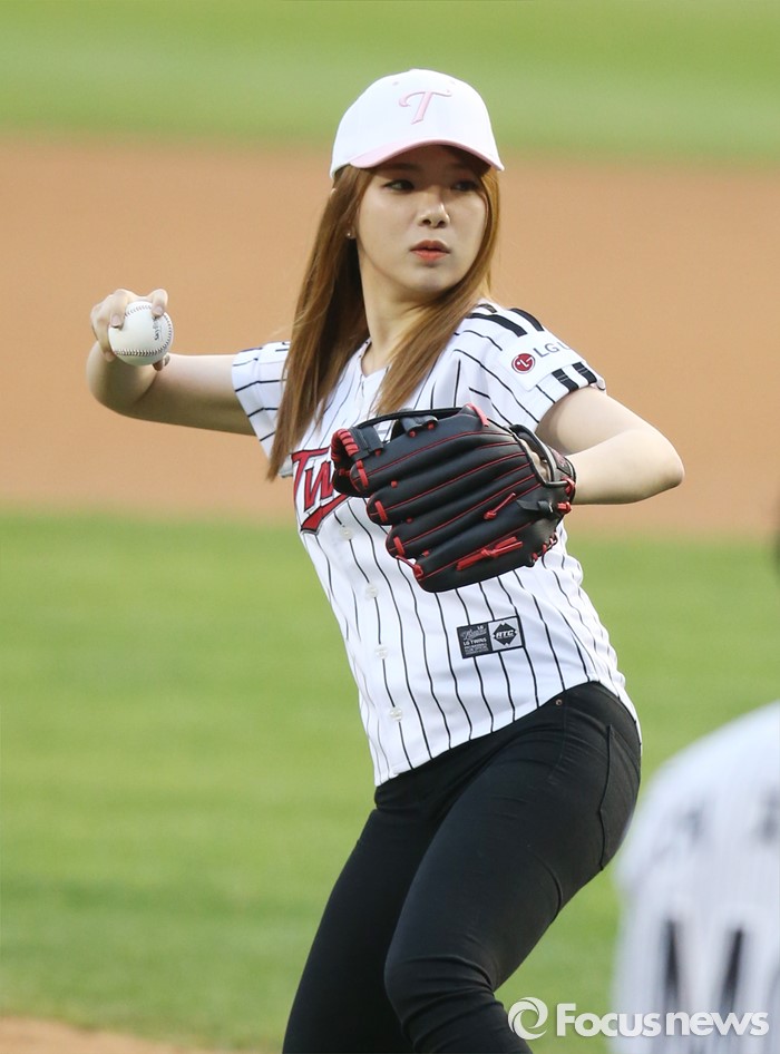 (서울=포커스뉴스) 13일 서울 잠실구장에서 열린 2016 프로야구 롯데-LG 경기에서 가수 타이니가 시구하고 있다.