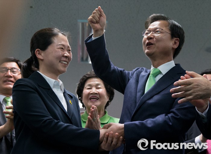 (광주=포커스뉴스) 제20대 국회의원 선거일인 13일 오후 광주 서구 국민의당 광주광역시당에서 천정배(오른쪽) 국민의당 공동대표와 권은희 국민의당 광산구을 후보가 출구조사 결과를 보고 환호하고 있다.