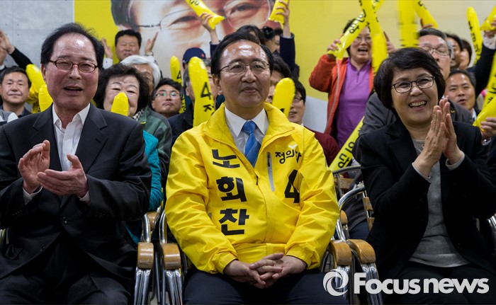 (창원=포커스뉴스) 제20대 국회의원선거가 끝난 13일 오후 창원시 성산구의 선거사무소에서 노회찬 정의당 창원 성산구 후보가 '예측 당선'이라는 방송사 출구조사 결과에 지지자들과 함께 기쁨을 표하고 있다. 노 후보의 좌측은 권영길 전 민주노동당 대표, 우측은 부인 김지선 씨.
