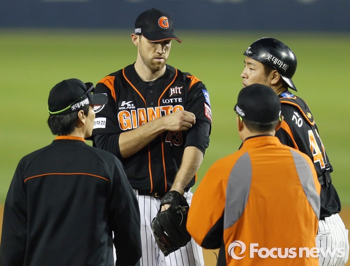 (서울=포커스뉴스) 13일 서울 잠실구장에서 열린 2016 프로야구 롯데-LG 경기 2회말 롯데 투수코치 주형광이 마운드에 올라가 린드블럼을 안정시키고 있다.