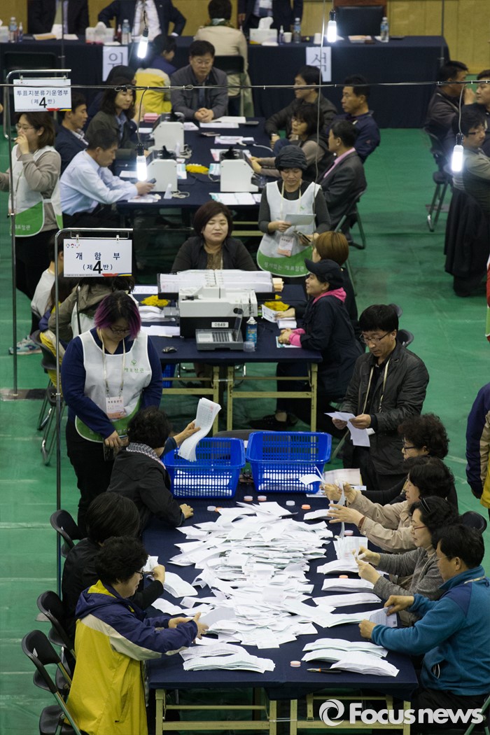 (서울=포커스뉴스) 제20대 국회의원선거일인 13일 오후 서울 종로구 경기상업고등학교 체육관에 마련된 개표소에서 종로구 선거관리위원회 관계자들이 개표하고 있다.