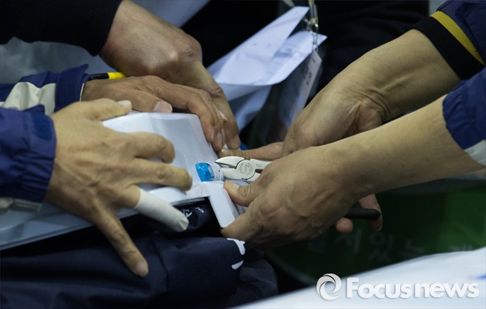(서울=포커스뉴스) 제20대 국회의원선거일인 13일 오후 서울 종로구 경기상업고등학교 체육관에 마련된 개표소에서 종로구 선거관리위원회 관계자들이 사전투표함을 개봉하고 있다.