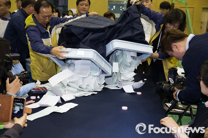 (서울=포커스뉴스) 제20대 국회의원선거일인 13일 오후 서울 종로구 경기상업고등학교 체육관에 마련된 개표소에서 종로구 선거관리위원회 관계자들이 사전투표함을 개봉하고 있다.