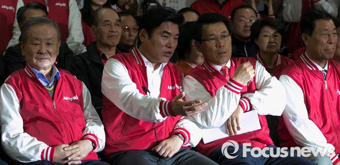 (서울=포커스뉴스) 제20대 국회의원 선거날인 13일 오후 서울 여의도 새누리당사에서 원유철(왼쪽 두번째) 원내대표와 이군현(오른쪽 두번째) 공동총괄본부장이 방송 3사의 출구조사를 시청하며 대화하는 동안, 강봉균(왼쪽) 공동선대위원장과 황진하(오른쪽) 사무총장이 침묵하고 있다.