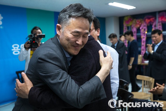 | △ '당선유력' 표창원, 지지자들과의 뜨거운 포옹 |