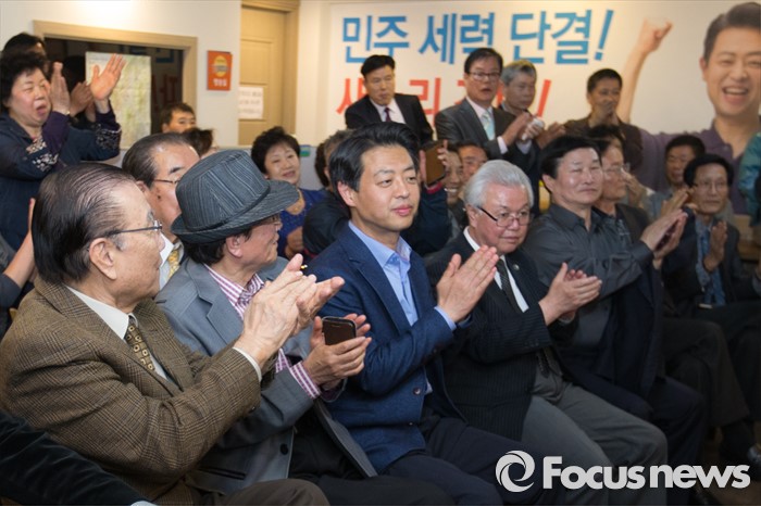 (서울=포커스뉴스) 13일 오후 서울 서대문구 김영호 더불어민주당 서대문구을 후보의 사무실에서 김후보가 지지자들과 함께 개표방송을 보며 박수치고 있다.