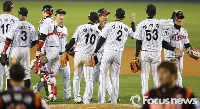 (서울=포커스뉴스) 13일 서울 잠실구장에서 열린 2016 프로야구 롯데-LG 경기에서 2연승을 한 LG 선수들이 마운드에서 하이파이브를 하고 있다.