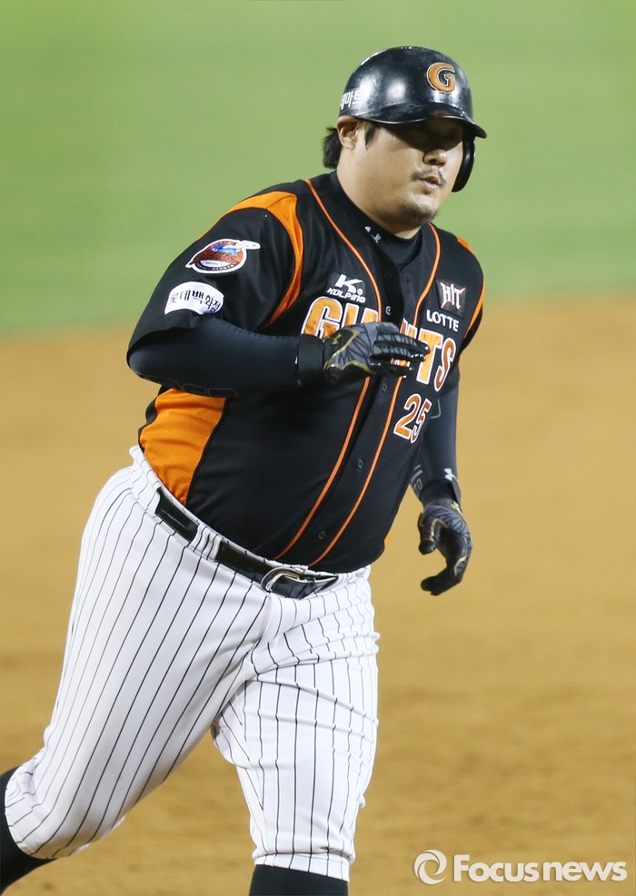 (서울=포커스뉴스) 13일 서울 잠실구장에서 열린 2016 프로야구 롯데-LG 경기 8회 1사후 롯데 최준석이 좌월 1점 홈런을 치고 홈인하고 있다.