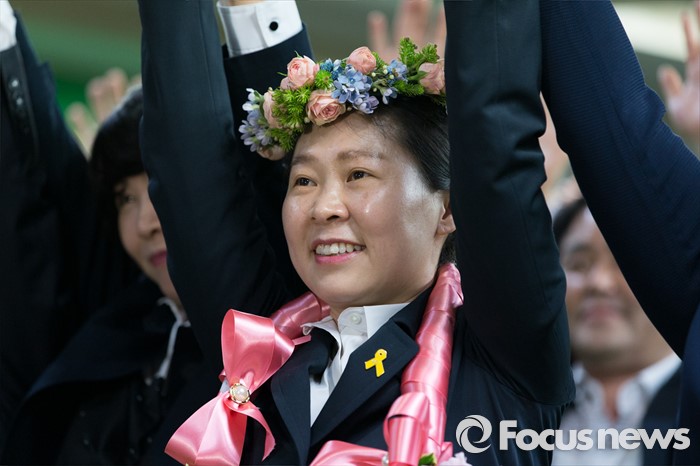 (광주=포커스뉴스) 권은희 국민의당 광주 광산구을 후보가 13일 오후 광주 광산구 수완동 선거사무실에서 당선이 유력해지자 지지자들과 환호하고 있다.