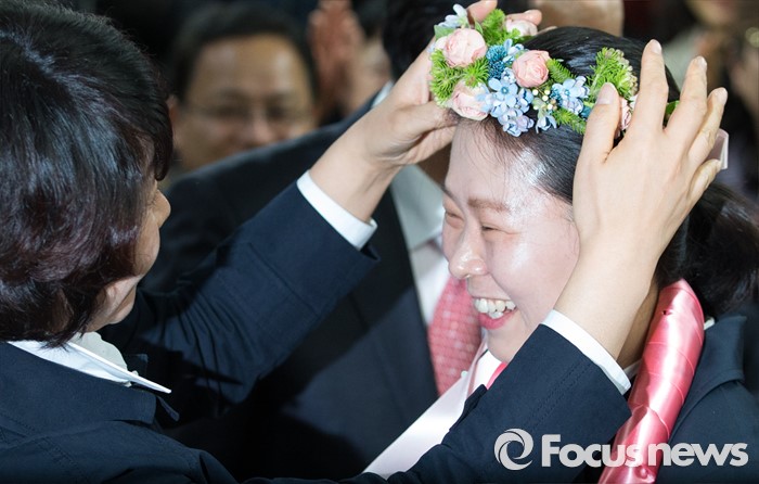 (광주=포커스뉴스) 권은희 국민의당 광주 광산구을 후보가 13일 오후 광주 광산구 수완동 선거사무실에서 당선이 유력해지자 지지자들과 환호하고 있다.