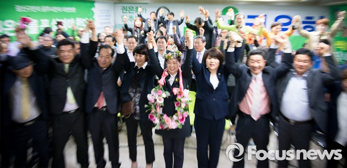 (광주=포커스뉴스) 권은희 국민의당 광주 광산구을 후보가 13일 오후 광주 광산구 수완동 선거사무실에서 당선이 유력해지자 지지자들과 환호하고 있다.