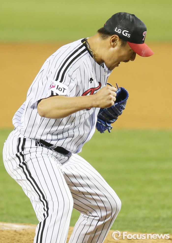 (서울=포커스뉴스) 13일 서울 잠실구장에서 열린 2016 프로야구 롯데-LG 경기에서 롯데 마지막 타자 황진수를 삼진으로 잡고 세이브를 따낸 LG 이동현이 주먹을 불끈 쥐며 환호하고 있다.