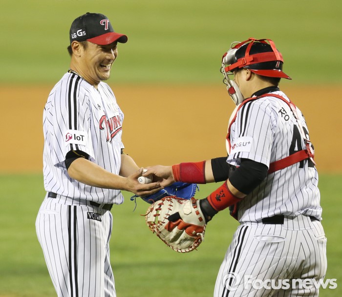 (서울=포커스뉴스) 13일 서울 잠실구장에서 열린 2016 프로야구 롯데-LG 경기에서 롯데 마지막 타자 황진수를 삼진으로 잡고 세이브를 따낸 LG 이동현이 포수 정상호에게서 공을 돌여 받으며 활짝 웃고 있다.