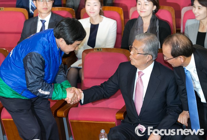 (서울=포커스뉴스) 20대 총선 투표일인 13일 오후 서울 여의도 국회 의원회관 대회의실에 마련된 더불어민주당 개표상황실에서 김종인(가운데) 비대위 대표 겸 선대위원장과 이종걸(왼쪽) 원내대표가 인사를 하고 있다.