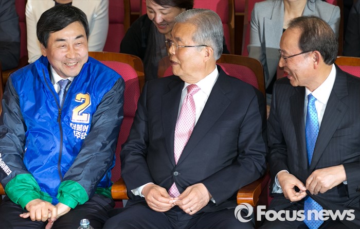 (서울=포커스뉴스) 20대 총선 투표일인 13일 오후 서울 여의도 국회 의원회관 대회의실에 마련된 더불어민주당 개표상황실에서 김종인(가운데) 비대위 대표 겸 선대위원장과 이종걸(왼쪽) 원내대표, 최운열 국민경제상황실장이 대화하고 있다.