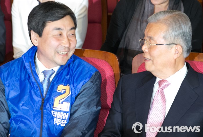(서울=포커스뉴스) 20대 총선 투표일인 13일 오후 서울 여의도 국회 의원회관 대회의실에 마련된 더불어민주당 개표상황실에서 김종인(오른쪽) 비대위 대표 겸 선대위원장과 이종걸 원내대표가 대화하고 있다.