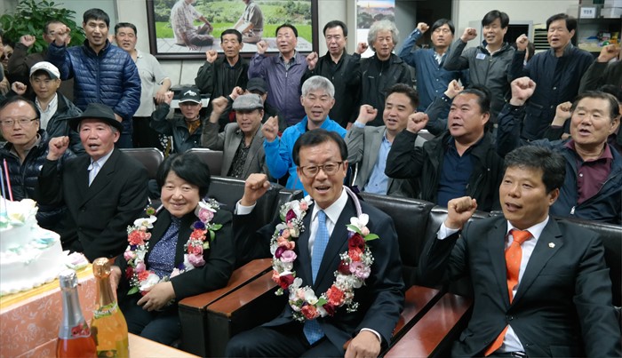 (서울=포커스뉴스) 20대 총선 당선이 확실시된 원혜영 더불어민주당 경기 부천오정구 후보와 부인 안정숙 씨가 13일 오후 경기도 부천 자신의 선거캠프에서 지지자들과 기뻐하고 있다. <사진제공=원혜영 후보 선거사무소>