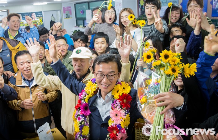 (부산=포커스뉴스) 전재수 더불어민주당 부산 북구강서구갑 후보가 13일 오후 부산 북구 선거사무소에서 당선이 확실시되자 지지자들과 함께 기쁨을 나누고 있다.